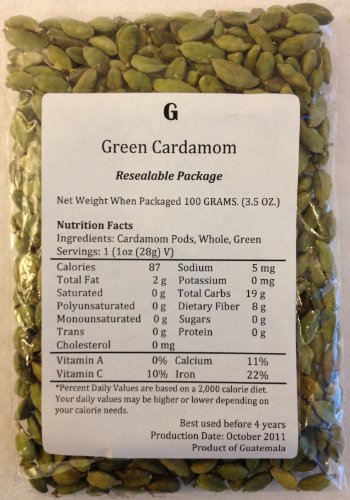 (Qty. 1) 100g (3.5 oz) sealable pouch of Super Jumbo natural green whole cardamom pods, extra fancy grade . Naturally grown in the hills of Guatemala.